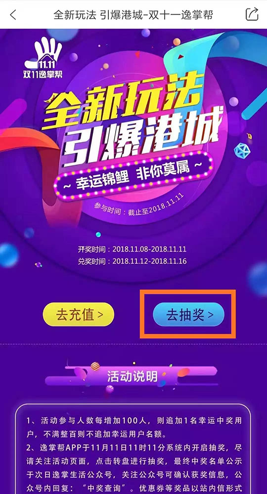 1,逸掌幫APP于11月11日11時11分系統(tǒng)內開啟抽獎,,敬請關注活動頁面,點擊轉盤進行抽獎,最終中獎名單公示于逸掌幫官方服務號。關注逸掌幫服務號,服務號內回復:“中獎查詢”,可確認獲獎信息。優(yōu)惠券等獎品以APP站內信形式直接發(fā)送至用戶APPID,屆時請注意查收。